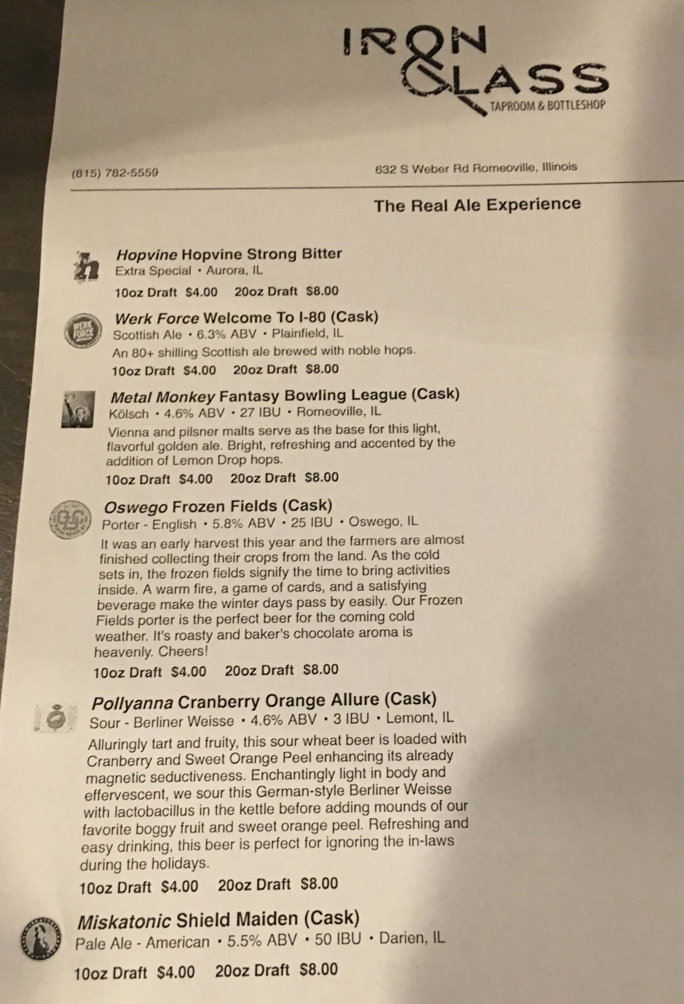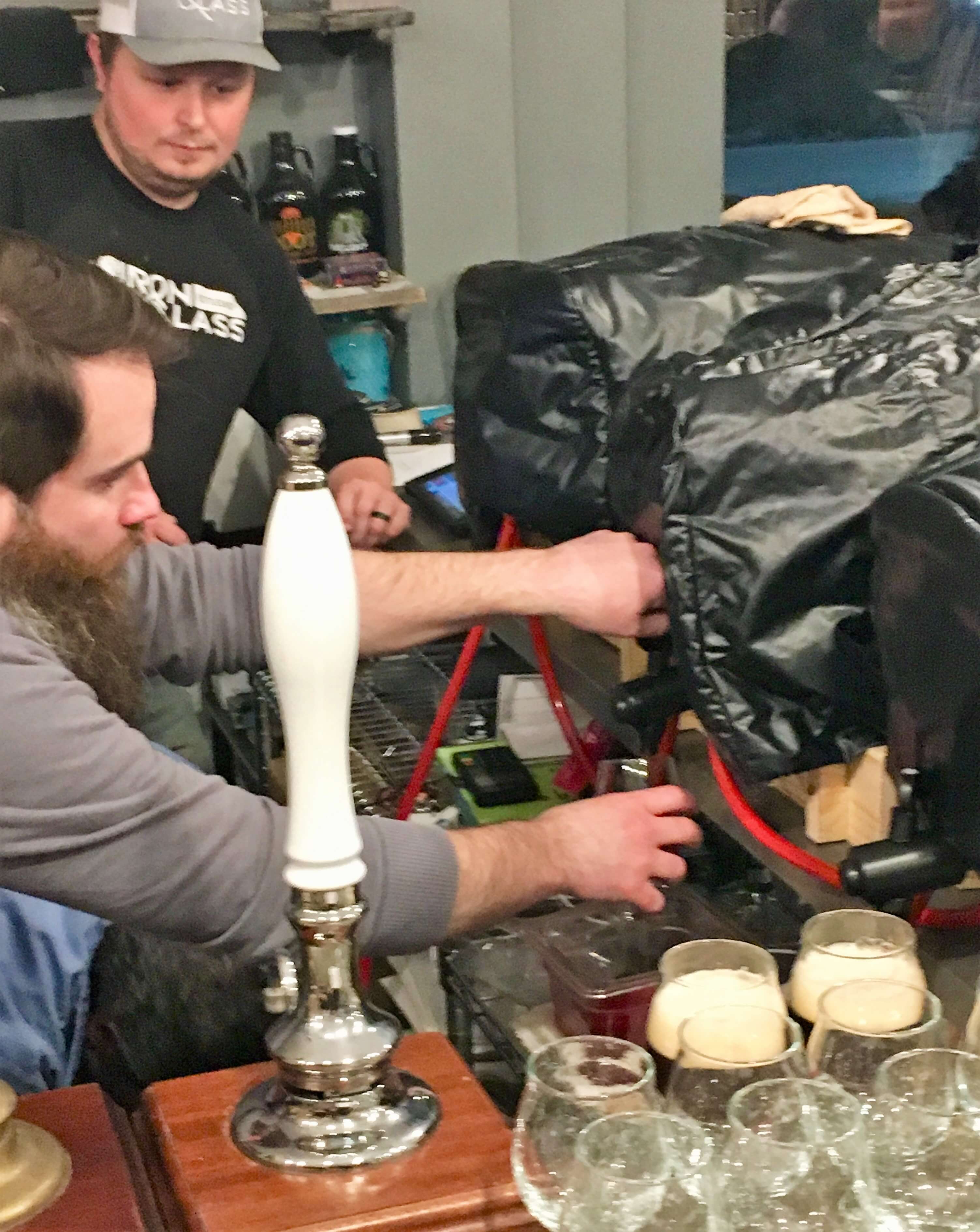 The week after FOBAB ended, and everyone was reeling from those high ABV barrel-aged beers, an event was held at Iron & Glass Tap Room and Bottle Shop in Romeoville, that provided beers at the other end of the spectrum. Travis Beard from Ugly Trucking teamed up with Ken McMullen and Kevin Herbst to invite 6 local breweries to provide a pin of their take on cask-conditioned real ale. Three hand pulls were put into service, two of which were donated to the cause by the Brit and Yankee podcast. The other three pins were simple gravity taps.